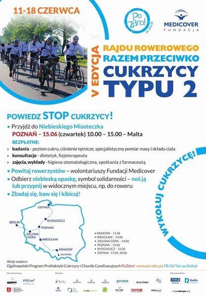 „Razem Przeciwko Cukrzycy typu 2” – to hasło charytatywnego Rajdu Rowerowego Fundacji Medicover, którego celem jest promowanie znaczenia zdrowego stylu życia w walce ze zwiększającą się epidemią cukrzycy, szczególnie typu 2. Wolontariusze, którzy od kilku miesięcy przygotowują swoją formę do startu w Rajdzie już po raz piąty pokonają trasę z południa na północ Polski, przejeżdżając dystans ponad 1000km. Start Rajdu 11 czerwca w Zakopanem, wielki finał – 18 czerwca w Gdyni. Do Rajdu, który ma już rangę wydarzenia międzynarodowego, dołączy druga grupa, startująca 13 czerwca z Berlina. Wyznaczona trasa wiedzie przez Kraków, Wrocław, Zieloną Górę, Poznań i Bydgoszcz. Wszędzie powstaną Niebieskie Miasteczka, w których każdy odwiedzający będzie mógł bezpłatnie sprawdzić stan swojego zdrowia, uzyskać porady specjalistów i dowiedzieć się, jak zapobiegać chorobom cywilizacyjnym wśród dzieci i dorosłych.