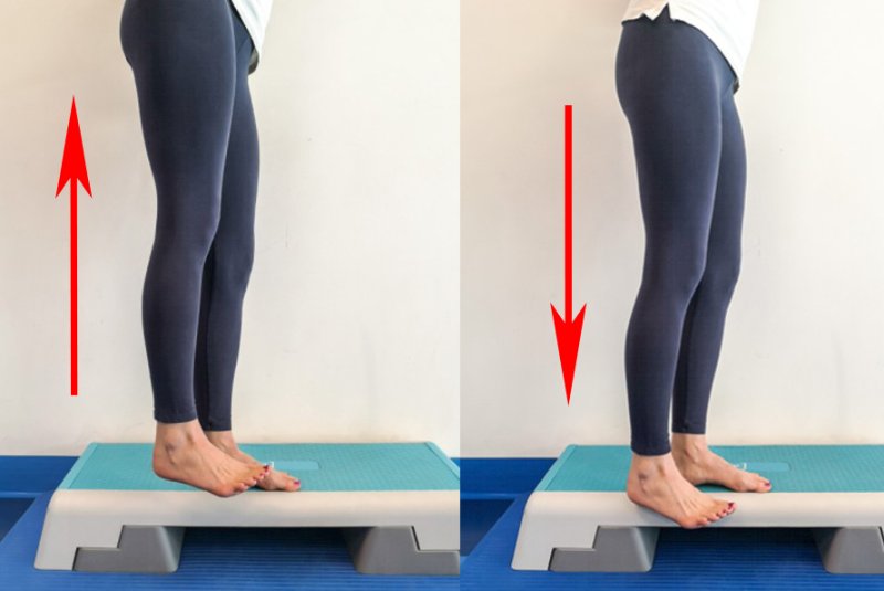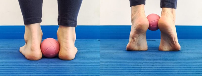 Perform toe raises while squeezing a ball between the heels. Do 3 sets of 15 repetitions at a slow pace.
