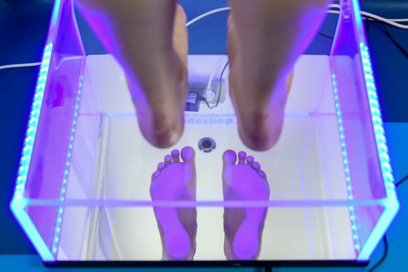 An orthopedist or physiotherapist can diagnose flatfoot using a special device called a podoscope, which allows for a static examination (for children, adolescents, and adults) to assess foot deformities through a mirrored reflection method. Another, more advanced diagnostic tool is a computer platform known as a podobaroscope, which analyzes pressure distribution on the plantar surface of the foot. However, anyone can perform a fairly simple test at home. Simply wet your feet and stand barefoot on a flat surface (e.g., concrete) where the footprints will leave an impression. A flat-valgus foot will not show the characteristic indentation on the inner side of the footprint.