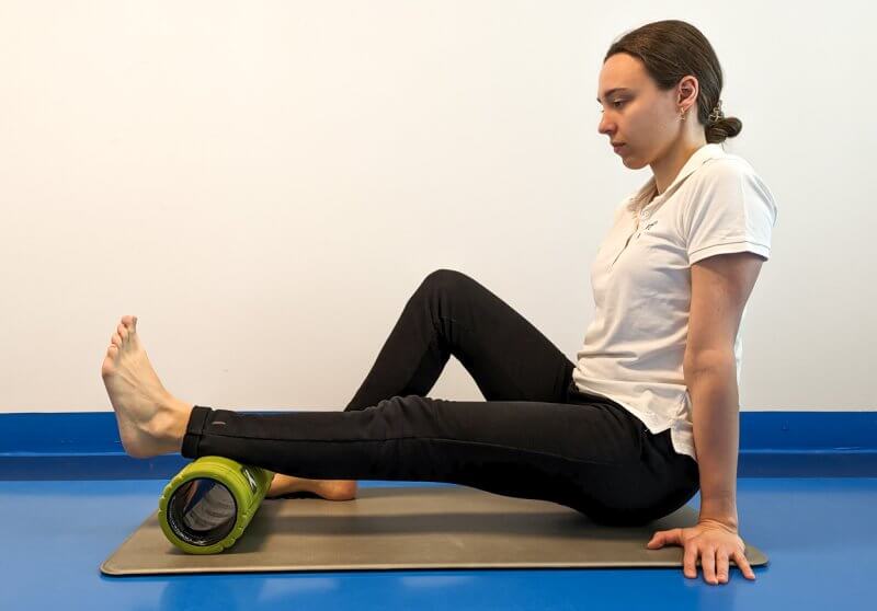 Rolling the back strap on a rollator. Support yourself on your hands, you can bend the other leg at the knee and put it on the floor to make it easier to roll. Place your leg on the roller and roll the back of your thigh and then the back of your calf, in several strands, slowly.