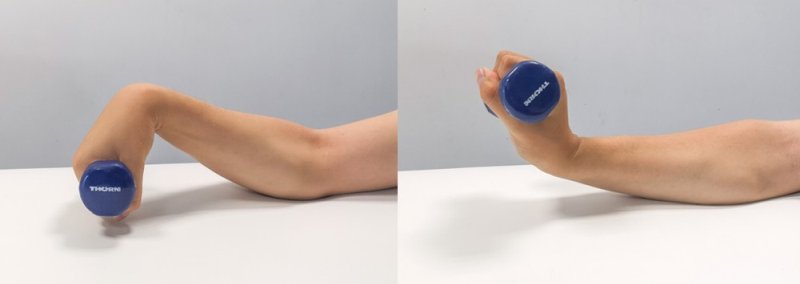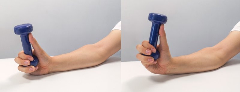 Support your forearm on the table, holding the dumbbell with an overhand grip. Starting position maximum palmar flexion - as in the first picture, then you strive for maximum dorsiflexion, maintaining the maximum position reached 5 sec, repeating this 15 times.