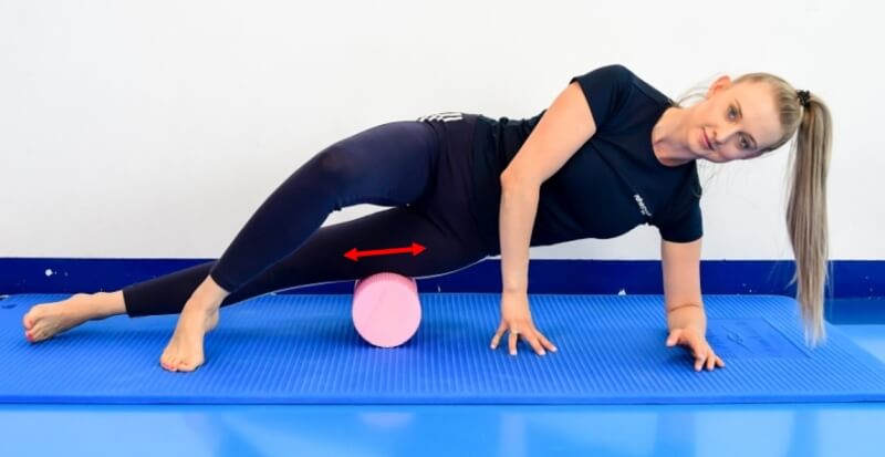 In a side-lying position, rest the outside of the thigh on a roller (or on a bottle full of water) and perform a slow massage of the area starting below the buttocks toward the knee ending just above it.