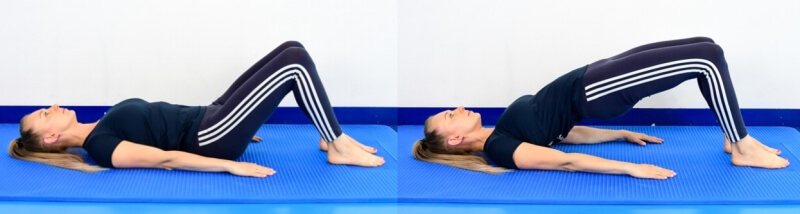 In a supine position, flex the lower limbs. We perform tension on the gluteal muscles after which we lift the pelvis upward. We avoid performing lumbar spine overstretching or thoracic thrusting. The movement is mainly to occur at the hip joints.