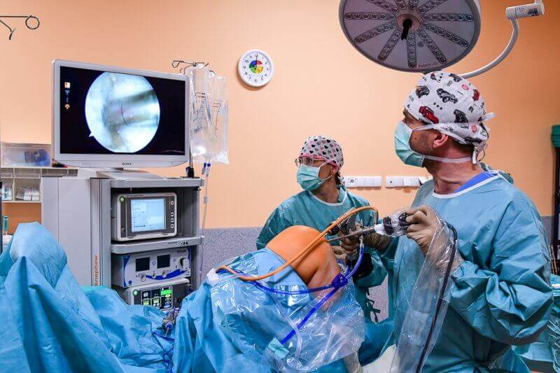 Knee arthroscopy is performed in an operating room setting under regional or general anesthesia. The patient is placed on the operating table in a supine position. The operated knee is placed on a special support. The surgical field will be thoroughly washed and protected with a sterile drape to minimize the risk of infection. The procedure can be divided into a diagnostic part, during which the orthopedist will carefully examine the knee "from the inside" in order to confirm or exclude the diagnosis made earlier, and a therapeutic part, aimed at repairing or removing damaged joint structures. The operation, depending on the complexity of the damage found, can last from several minutes, to about 2 hours. In the vast majority of cases, the patient remains in the hospital until the next day.