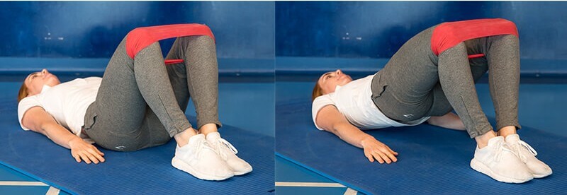 Exercise 5. In a supine position with the physiotherapy tape in a loop on the knees, with the feet aligned together, stretch the tape by bending the knees to hip width, lift the hips upward while keeping the tape taut.
