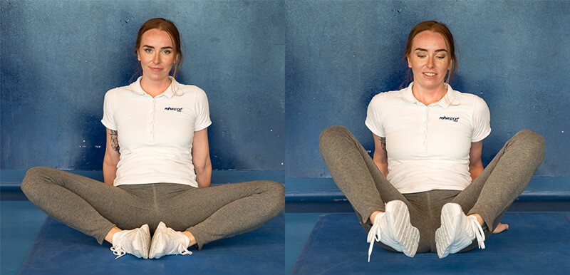 Exercise 1. In a bent sit with knees bent outward, grasp each other's feet with the palms of your hands and alternately, once with the left and once with the right leg, touch the toes of your feet to your nose.