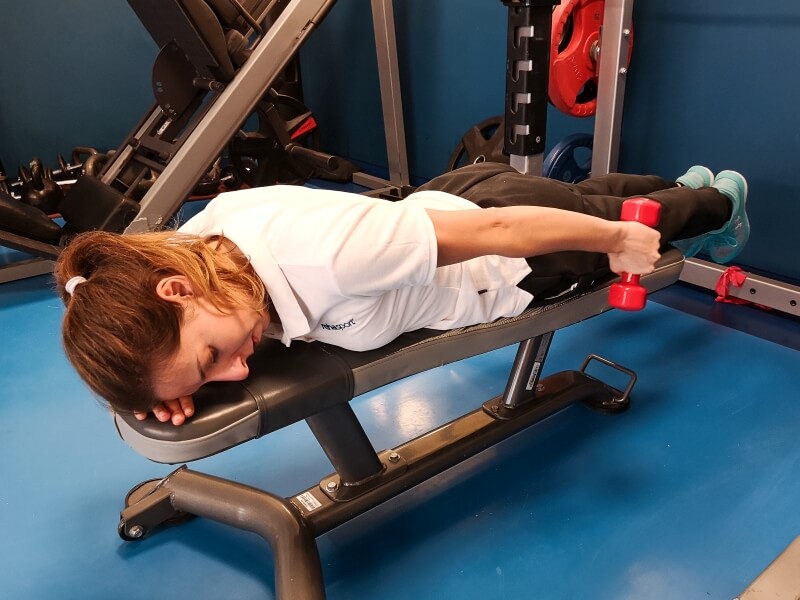 Starting position: lying on the stomach with the arm close to the body, elbow straight, in the hand a weight (0.5-2kg).