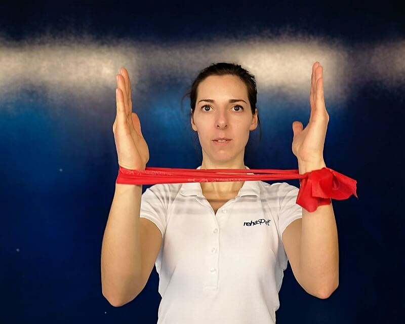 Starting position: standing with an elastic band in a loop between the wrists/forearms, elbows bent 90 degrees.