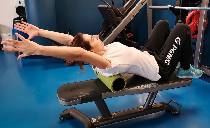 Execution: on an inhalation, lift the arms (weights/elastic tape can be added) behind the head and straighten the thoracic spine.