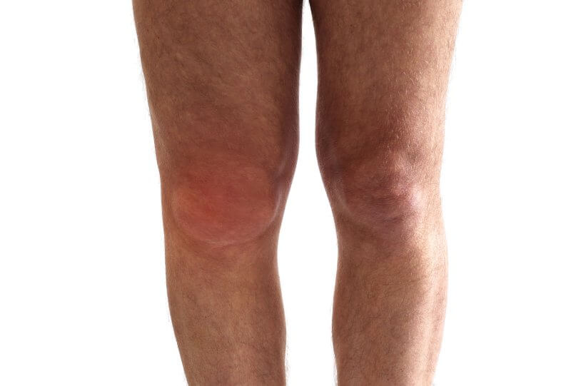 - Zmiany skórne - skóra nad kolanem jest napięta i błyszcząca z powodu obrzęku.