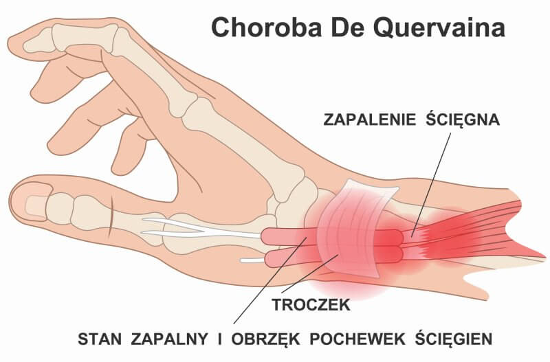 - głównym objawem choroby De Quervaina jest ból podstawy kciuka i nadgarstka po tej samej stronie,