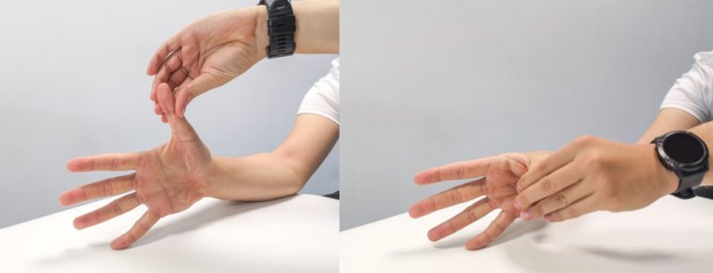 Ułóż rękę z palcami wyciągniętymi na stole, następnie zginając kciuk i palec 5 zetknij je paliczkami ze sobą. Możesz poczuć rozciąganie przy podstawie kciuka. Utrzymaj tę pozycję przez 15-30 sek., powtarzając to 10 razy.